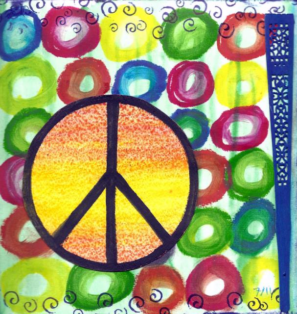 This was done on a watercolor wash green background. I wanted to play with some new Crayola Slick Sticks . They are so creamy and smooth and colors blend very nice. I used them for the circle background. I used a rubber stamp and black dye ink for top and bottom borders. The Peace sign was something I had leftover from another project. It's a watercolor background and lines are drawn with a Sharpie
